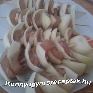 Kockára vágom a húst és befűszerezem és hagyom állni addig amíg a többi hozzávalót el nem készítem .A vöröshagymát megpucolom és két felé vágom és szirmaira szedem,ha túl nagy akkor még azt is ketté vágom.Szalonnát felkockázom.A három fajta hozzávalót egymás mellé rakjuk tálkákba. Fogunk 1 saslikpálcát ráfűzzük a hagymát a kockázott szalonnát és a húst és így tovább amíg a végére nem érünk.Egy kis helyet mindenféleképpen hagyunk hogy megtudjuk fogni.Hasábkrumplival szoktam tálalni. De lehet még csinálni hozzá fokhagymás tejfölt. Elkészítése ízlés szerint tejföl,só,fokhagyma vagy fokhagymapor.