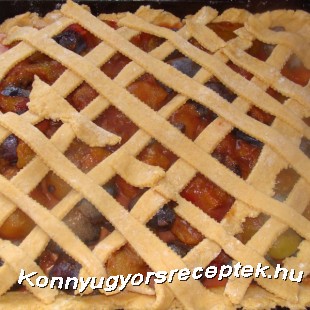 A megmaradt tésztát kinyújtjuk, derelyevágóval csíkokra vágjuk,majd a süteményt berácsozzuk.Előmelegített sütőben sütjük.