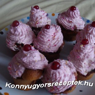 A krémet habzsákból nyomjuk a muffinok tetejére,ribizliszemekkel díszítjük.