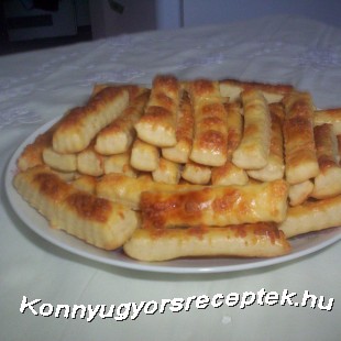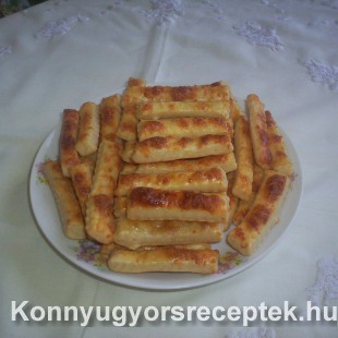 A hűtőből kivéve 2 mm vastagságúra kinyújtom, a tetejét felvert tojással bekenem és reszelt sajttal megszórom. Ezután 1 cm széles, 5-6 cm hosszú darabokra derelyemetszővel felvágom.