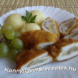 A csirkemellet megmossuk, vékony szeletekre vágjuk, és enyhén kiklopfoljuk. A szeleteket meghintjük sóval, borssal, majd ráhelyezünk egy szelet sajtot, és néhány szem szőlőt.