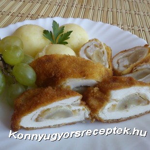 Óvatosan feltekerjük (ha szükséges hústűvel megtűzzük) , majd lisztbe, tojásba, és zsemlemorzsába forgatjuk. A panírozott roládokat forró bő olajban aranybarnára sütjük, majd burgonyapürével, vagy rizzsel tálaljuk.