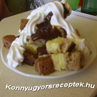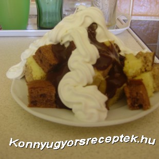6. Az öntet elkészítéséhez az 5 dl vizet, a sót és a cukrot feltesszük melegedni. Összekeverjük a kakaóport, a csokoládé pudingporral és 1 dl vízzel, majd a forralt vízhez adjuk, és felfőzzük. Rumaromával ízesítjük.