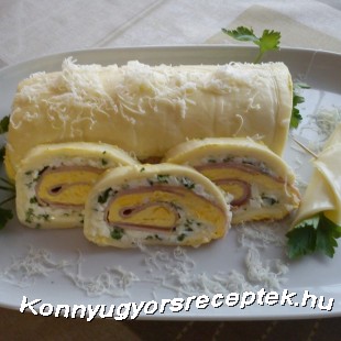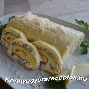 Egy tepsibe sütőpapírt helyezünk, amire ráfektetjük a sajtszeleteket úgy, hogy kissé fedjék egymást. Ráreszeljük a trappistasajtot, és 2 percre előmelegített sütőbe tesszük, de éppen csak annyira, hogy a sajtok egymáshoz tapadjanak. A tojást keményre főzzük, majd a sárgáját kivesszük. A tojás fehérjét apró kockára vágjuk, a petrezselyemzöldet felaprítjuk és a sajtkrémhez keverjük, majd pici sóval, és fehérborssal ízesítjük. A tojás sárgáját a vajjal és a mustárral jól elkeverjük és szintén kevés sóval és borssal ízesítjük. A sajtlapokra először a tojásfehérjés masszát kenjük rá egyenletesen, majd az egészet befedjük a sonkaszeletekkel. Ezt követően a tojássárgás keveréket kenjük a sonkára, és az egészet óvatosan feltekerjük, majd hűtőszekrénybe tesszük. Éles késsel szeleteljük, és pirítóssal tálaljuk.