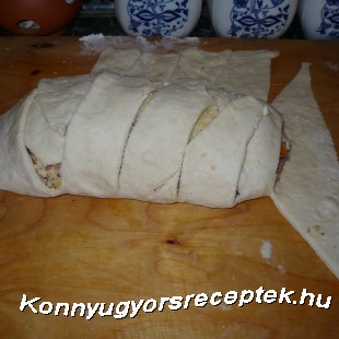 A tésztát kinyújtjuk, derelyevágóval körbe vágjuk. A közepére egy csíkban belerakjuk a tölteléket. A széleit a vágóval bevagdaljuk. Ráhajtogatjuk.