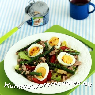 Végül helyezzük rá a félbevágott főtt tojást, majd locsoljuk meg a maradék öntettel, és úgy kínáljuk.