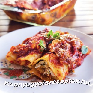 4. A cannolli tésztákat al dente főzzük, lecsepegtetjük majd habzsákból kinyomva megöltjük a tésztákat a töltelékkel. Ha lasagne tésztát használunk, terítsük a kifőtt lapokat egy sütőpapírra, kenjük meg egy evőkanál töltelékkel majd feszesen csavarjuk fel őket a rövidebb oldaluktól kezdve. A megtöltött tésztákat helyezzük egy nagy olajjal kikent kockatepsibe vagy két külön üvegtálba, locsoljuk meg a szósszal és tépkedjük szét a tetejére a mozzarellát.