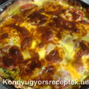 Tésztára tesszük a tölteléket, majd a reszelt sajt felét, erre a vékonyra szeletelt paradicsomot, majd ráöntjük a tojással elkevert tejszínt.