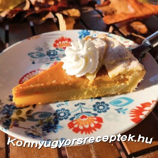 4. A sütőpapír és a súlyok eltávolítása után beletöltjük a krémet, majd ha szeretnénk, ízlés szerint díszítjük, én falevél formákkal díszítettem a szélein. Visszatesszük a sütőbe és 15 percig 200 C-on, majd további 30 percig 170 C-on készre sütjük. Szeletelés előtt hagyjuk langyosra hűlni, habtejszínnel tálaljuk.
