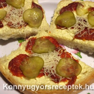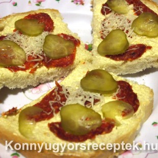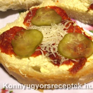 Az alapanyagokat vékony szeletekre vágjuk, és szép sorban díszítjük a kenyérszeleteket, és a végén megszórjuk reszelt sajttal.