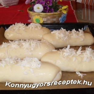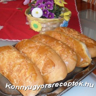 Az élesztőt kis cukros tejben felfuttatjuk. A többi hozzávalót összemorzsoljuk,( a vaj kivételével) hozzáadjuk a felfutott élesztőt, majd közepesen kemény, jól nyújtható tésztát dagasztunk. Kelesztőtálban kelesztjük duplájára. Miután megkelt, lisztezett felületre borítjuk. 8-10 darabra osztjuk, gömbölyítjük, ismét kicsit pihentetjük. Egyesével kör alakúra nyújtjuk, kb. 2 mm vastagságúra. A hideg vajat vékony szeletekre vágjuk. Egy-egy csíkot teszünk minden tésztára. A vaj mellett visszahajtjuk a széleket, így tekerjük fel. Sütőpapírral bélelt tepsire sorakoztatjuk őket, ismét duplájára kelesztjük.. Felvert tojással lekenjük, reszelt sajttal megszórjuk, majd 180 fokos sütőben kb. 20 perc alatt pirosra sütjük őket. / sütő aljába kis lábasba vizet teszünk, gőzös sütő )