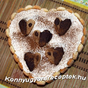 1.Egy kb 22 cm átmérőjű szív alakú tortaformát sütőpapírral bélelünk, majd kirakjuk az oldalát felezett, az alját pedig egész babapiskótákkal.