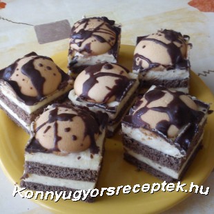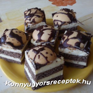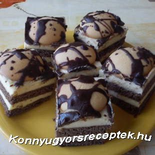 A tészta hozzávalóit összedolgozzuk és két részre osztjuk. Vékonyra nyújtjuk, és zsírozott, lisztezett tepsiben két lapot sütünk belőle. A tejet a pudinggal sűrűre főzzük, a Rámát a porcukorral habosra keverjük és a kettőt jól összedolgozzuk. A krémet két részre osztjuk, felét a két lap közé tesszük, felét a második lapra kenjük. A krémre helyezzük a piskótatallérokat, melyeket a gőz fölött megolvasztott csokoládéval meglocsolunk.