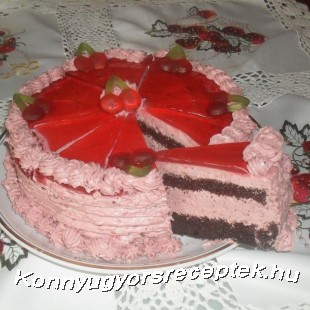 A krémhez : A magozott meggyet a meggylével és a cukorral pár percig főzzük. A tejjel simára kevert pudingport hozzákeverjük, és besűrítjük. Tűzről levéve botmixerrel pürésítjük , hozzákeverjük a zselatint. Kézi elektromos habverővel simára keverjük, majd kihűtjük. A tejszínt kemény habbá verve a hideg püréhez adjuk. A kapcsos forma aljába tesszük az egyik lapot, ráöntjük a krém felét. A másik lappal befedjük, befedjük krémmel ( hagyunk keveset az oldalára). Tortazselével leöntjük. Hűtőbe tesszük. Pár óra múlva ( másnap) vízbe mártott késsel kőrbe vágjuk , levesszük róla a karikát. Tálcára téve az oldalát bekenjük a maradék krémmel, majd tetszés szerint díszítjük.