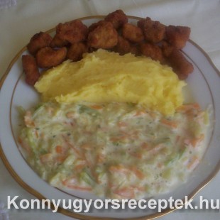 A sárgarépát és a cukkinit nagyjából gyufaszálszerűen felszeletelem. Mivel a cukkini hamar párolódik, így előbb a répát párolom meg, és utána a cukkinit. Én most egészségesen párolóedényben tettem ezt, de természetesen lehet más módon is párolni. A párolás után a főzőtejszínt 1 laza evőkanál liszttel elkeverem és a répás-cukkinire öntöm, majd ráteszem a fűszereket is, pici borsot, szintén nem sok sót és a 1,5 mokkáskanál szárított tárkonyt is és lassan összefőzöm az ízeket. Ez a köret magában is igen finom, de természetesen ebédre fogyasztva önmagában nem lenne elég. Általában krumplipürével és húsokkal együtt szoktam elkészíteni. Most rántott csirkemell falatokat készítettem hozzá, de lehet bármilyen sült hús, rántott hús, rántott sajt, natúrszelet, a fantáziánkra van bízva. Igazán tudom ajánlani kipróbálásra, mert egy könnyű és ízletes köret. A felhasznált mennyiségből 5 személy bőven jól tud lakni, természetesen a mellé feltálaltakkal együtt.