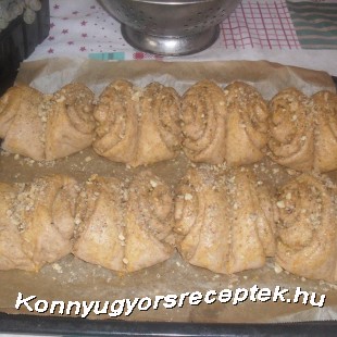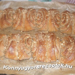 A tészta hozzávalóiból rugalmas tésztát dagasztunk. ( élesztő kicsit felfuttatva, majd a meleg margarin a dagasztás végén hozzáadva.) Meleg helye kb. 50 perc alatt megkelesztjük. Ha megkelt lisztezett deszkán téglalap alakúra nyújtjuk ( kb. 60x40 cm) megkenjük olvasztott margarinnal, megszórjuk a darált dióval, majd rá csorgatjuk a mézet. Feltekerjük mint a bejglit. 8 egyforma darabba vágjuk. Fakanál nyelével a közepén lenyomjuk, kifordítjuk, Sütőpapíros tepsire téve ismét kelesztjük. ( kb. 1 óra). ha megkelt megkenjük tojással, megszórjuk a tojással, megszórjuk a durvára tört dióval, és 220 C fokra előmelegített sütőbe toljuk, amit azonnal visszaveszünk 190 C fokra. 15-18 perc alatt szép pirosra sütjük.