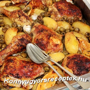 Tálaláskor helyezzük tányérra a pirosra sült csirkecombot, majd ízlés szerint tegyünk mellé a krumpliból, olajbogyóból, és a sült fokhagymából, majd úgy kínáljuk.
