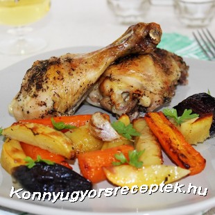 A tepsibe kanalazzuk bele a zsírt, majd öntsük rá a bort. Ezután helyezzük bele az előzőleg befűszerezett combokat, majd rakjuk köré a feldarabolt krumplit, sárgarépát, hagymát, és a pucolatlan fokhagymagerezdeket.
