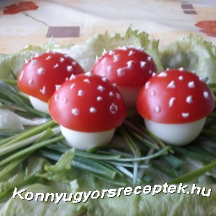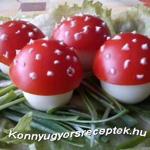 A tojásokat keményre főzzük, majd mindkét végéből levágunk egy-egy darabot. A sárgáját óvatosan kiszedjük, majd a sajtkrémmel, a vajjal, a mustárral és a fűszerekkel jól elkeverjük. Ezt követően óvatosan visszatöltjük a tojásfehérjébe. A paradicsomokat kettévágjuk, magjukat kiszedjük, és a tojások tetejére helyezzük. Majonézzel pöttyöket teszünk rá, és tálalásig hűtőbe tesszük.