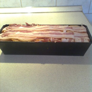 A hozzávalókból fasírtot készítünk, egy tálca aljára kiterítjük a bacon szalonna szeleteket, erre szétterítjük a kész fasírtot, beterítjük füstölt sajt szeletekkel, vagy ráreszeljük a sajtot, egy csíkban rárakjuk a zöld hagymákat, savanyú uborkát, vagy ami van a hűtőben a bacon szalonnával együtt feltekerjük.