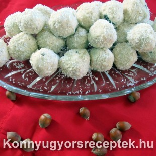 A túrót a porcukorral és a vaníliás cukorral összekeverjük, majd 10 percig állni hagyjuk! Ezután hozzáadjuk a 15 dkg kókuszreszeléket és összekeverjük. A masszából kis golyókat formázunk ,megforgatjuk kókuszreszelékben.