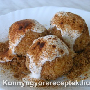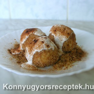 6. Még melegen meghempergetjük őket a zsemlemorzsában, és (esetleg porcukorral kikevert) tejföllel, fahéjjal meghintve tálaljuk.