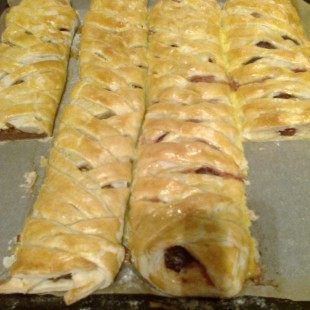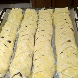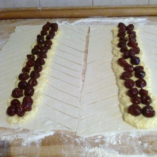 A leveles tésztát téglalap alakúra kinyújtjuk, kettévágjuk, majd hosszában a közepére helyezzük az összekevert tölteléket, tetejére meggyet teszünk, a tészta két oldalát bevagdossuk, majd egymásra fonjuk, tojással megkenjük, és előmelegített sütőben 25 perc alatt megsütjük.