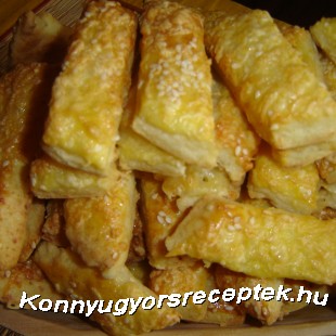 3.Hűtőből kivéve lisztezett deszkán nyújtsuk kb. 0,5 cm vastagra, kenjük meg a tetejét a felvert tojással, szezámmaggal és a reszelt sajttal.