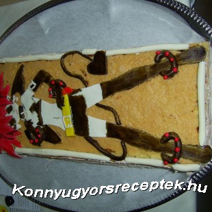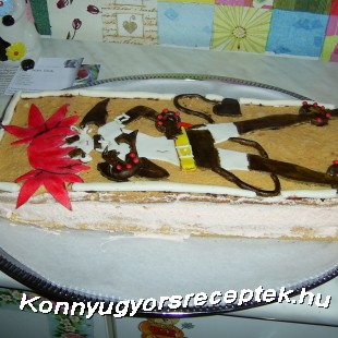Az alsó piskótára rákenünk ízlés szerint a krémből (nekem kb. 1/3-a megmaradt), majd ráfektetjük a kinyújtott marcipánmasszát, erre még kenünk a krémből és rátesszük a másik piskóta lapot.