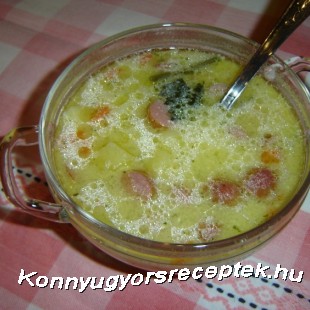 1. A burgonyát,hagymát és a zöldségeket megtisztítjuk. A hagymát apróra a burgonyát és a zöldségeket kis kockákra vágjuk. A virslit karikázzuk fel.