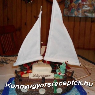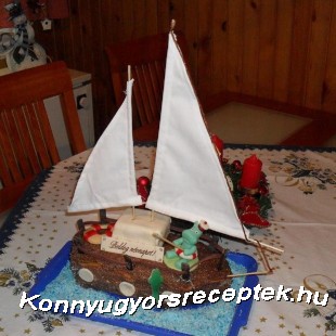A krémhez: a vízben megfőzzük a pudingot, mikor lehúzzuk a tűzről, hozzáadjuk a csokit, szép simára keverjük, kihűtjük. A margarint a cukorral habosra keverjük, majd a kihűlt pudinghoz adjuk. A kihűlt piskótát két, vagy három lappá vágjuk, majd csónak alakúra ” faragjuk”. megöltjük a lapokat a krémmel, kívülről is. Jöhet a dekorálás: Hurkapálcikából árbocot, kis fehér anyagból vitorlát készítünk, és tetszés szerint díszíthetjük.