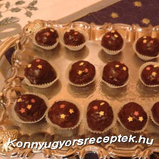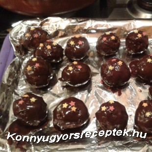 Az ét csokit, a vajat és az olajat vízgőz felett felolvasztjuk. A csokimázba egyenként belemártjuk a golyókat, tálcára rákjuk, és dekor cukorral díszítjük. Ha teljesen megdermed a csokimáz, akkor fogyasztható.
