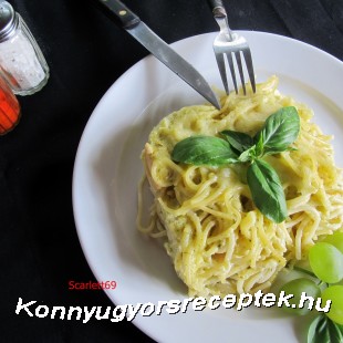 A szószhoz adjuk a pestót, összekeverjük, majd a megfőtt tésztával is elkeverjük.