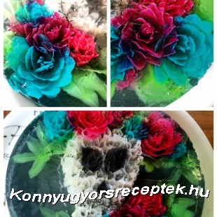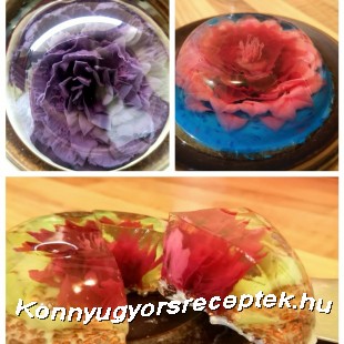 9. A zselatint kedvünk szerint színezhetjük és ízesíthetjük aromával, színezékkel és fecskendőbe töltve zselé formázó tűkkel tetszőleges mintákat nyomunk az áttetsző alap zselatinba.