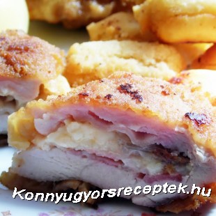 A húst éles késsel bevágjuk és szétnyitjuk mint a könyvet. Kiklopfoljuk, sózzuk. Egy kicsit állni hagyjuk, addig elkészítjük a tölteléket. Felkarikázzuk a hagymát, kolbászt, sonkát. A húst elővesszük és minden darab húst megtöltünk a következőkkel: sonka, hagyma, kolbászkarika, sajt és a végén a bacon. Ráhajtjuk a hús másik felét, és ezután bepanírozzuk. Olajban kisütjük.